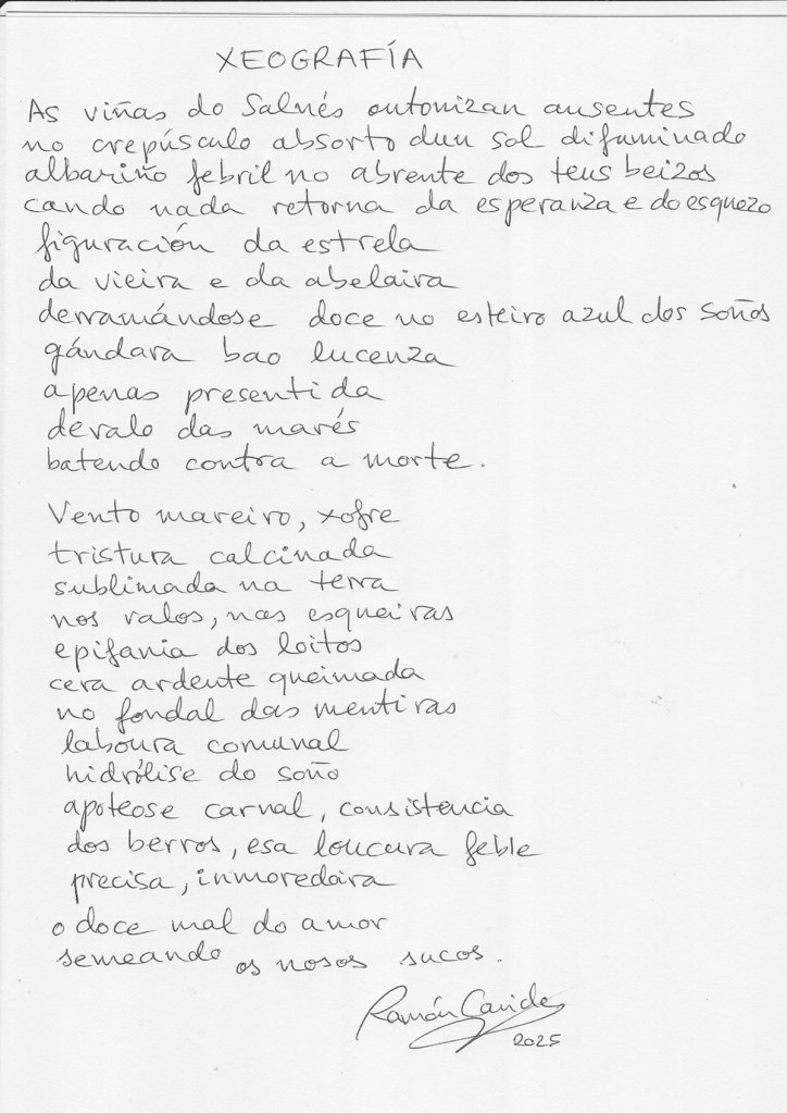 Editorial Juglar ha publicado recientemente Indehiscencia (2023), primera selección bilingüe galego-castellana de sus poemas, realizada por el autor en colaboración con Darío Gancedo, completando la revisión y actualización de su obra poética. Esta antología tuvo continuidad con Diacrónica (2025), de donde procede este poema.